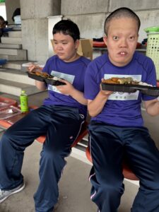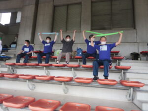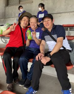 当日は早朝からの小雨。不安を覚えながらも出発しましたが着いた時には雨も上がり晴れ間も見え始めて絶好の競技日和となりました。今回丸亀競技場が初めてのご利用者ばかりで到着早々大きさに大興奮!開会式・ラジオ体操・陸上競技が終了していよいよみんなの出番です。みんなそれぞれに一枚入魂し、入っても入らなくても思う存分に楽しみました♪昼食のお弁当もボリューム満点で大満足!いつもは経験できないような解放感に包まれながら、園でのご利用中とはまた違った笑顔を見ることができて、ご利用者も職員も充実した時間を過ごすことができました。