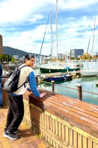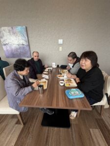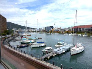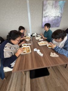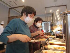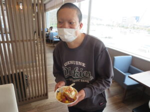 11月11日(火)に通所生活介護の遠足で徳島方面へ行きました。少し肌寒い中でも晴天に恵まれ遠足日和となりました。車内は秋の陽気に照らされてポカポカと温かく、皆さんの会話も弾みながら長時間のドライブを終えて『徳島グランヴィリオホテル』に到着。ホテル別館の『ミリカ』で90分のランチビュッフェを堪能しました。こちらのホテルは徳島市内でありながら河口付近の河川沿いにあり、ヨットハーバーに隣接していることもあって都会的な雰囲気を窓から臨むことができます。またビュッフェは、自分の食べたいものをたくさんの種類から自分で選んで食べることができるので皆さんからは大人気で、「あれもこれも食べたくて困る」「めっちゃ美味しい!」「食べ過ぎた!!」など嬉しい悲鳴も聞こえてきました。おしゃれに盛り付けて楽しむこともでき、目の前にはおしゃれで美味しいお料理、外を観れば都会的な風景が広がる、、、そんな素敵な90分はあっという間でした。昼食後にヨットハーバーをバックに記念写真を撮影して『とくとく市場』へ移動です。こちらではJA産直市場や物産センターでお買い物を楽しみました。しっかりと食べたばかりなのに食材に目が向いたり、お土産を買ったり、鯉の餌やりをしたりとそれぞれに納得のいく過ごし方ができたようです。ご利用者・保護者様・職員が一緒に楽しめて大満足の一日でした。