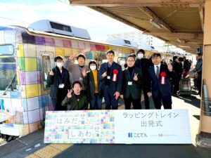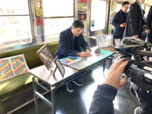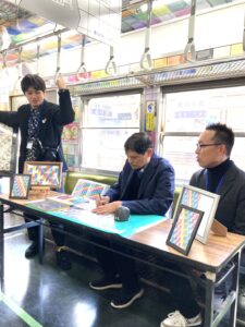 12月4日、琴電仏生山駅にて山内雅人さんのアート作品がラッピングされた電車の出発式・試乗式がありました。